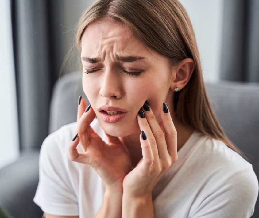 Žena držící tvář v bolesti, naznačuje problém se zubem